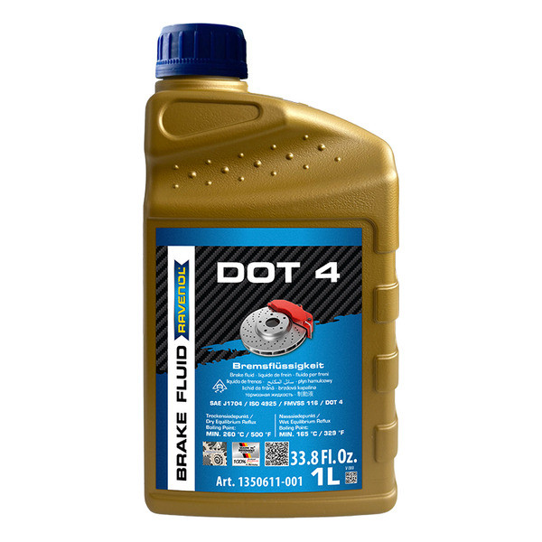 RAVENOL DOT 4-ը Գերմանիայում արտադրված բարձրակարգ արգելակային հեղուկ է՝ պատրաստված բարձր մոլեկուլային բորաթթվի էսթերների խառնուրդից՝ բարձր արդյունավետ հակաօքսիդանտներով, կոռոզիայի ինհիբիտորներով և հավելանյութերով, որոնք կանխում են միջադիրների և էլաստոմերների այտուցը։