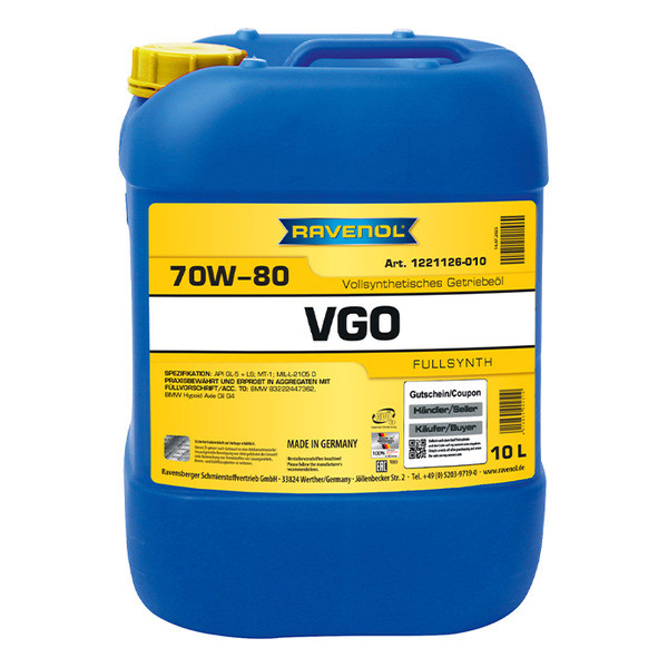 RAVENOL VGO SAE 70W-80 LS-ը մշակված է բարձրորակ սինթետիկ բազային յուղերով, հատուկ հավելանյութերով և արգելակիչներով՝ փոխանցման տուփի պատշաճ աշխատանքն ապահովելու համար։ Այն հատուկ մշակվել է փոխանցման տուփերի արտադրողների վերջին պահանջները բավարարելու համար, մասնավորապես՝ սահմանափակ սահքի դիֆերենցիալներով BMW մեքենաների համար։