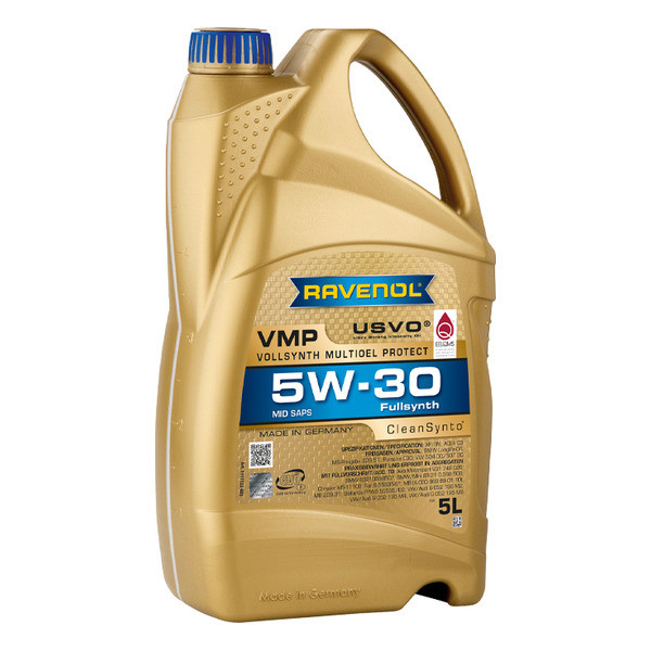 RAVENOL VMP 5W-30 – Լիովին սինթետիկ, հեշտ հոսող, միջին մոխրի (MID SAPS) շարժիչային յուղ, որը պատրաստված է USVO® և CleanSynto® տեխնոլոգիաների կիրառմամբ՝ մարդատար բենզինային և դիզելային շարժիչների համար՝ տուրբո լիցքավորմամբ և վառելիքի ուղղակի ներարկումով և առանց դրա: Ընդլայնված փոխարինման միջակայքերը՝ ըստ տրանսպորտային միջոցների արտադրողների պահանջների: